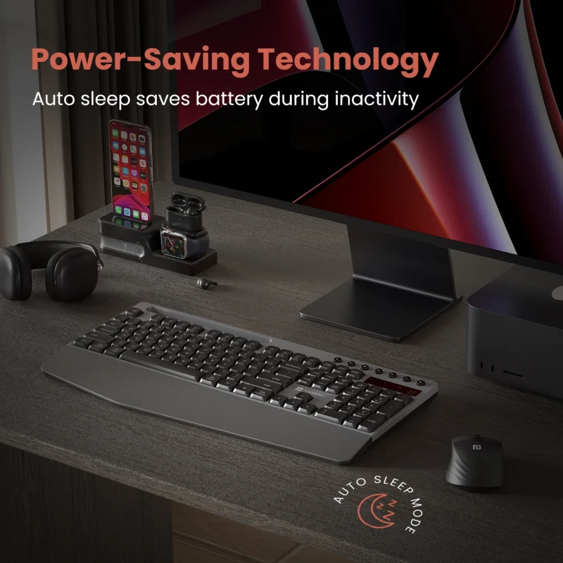 Comfort has been given top priority in this design. The built-in wrist-rest reduces strain during long hours of typing, promoting a more ergonomic working posture. The keys are soft, responsive, and designed for quiet operation, ensuring minimal typing noise while delivering excellent tactile feedback. The included wireless mouse complements the keyboard with smooth tracking, precision, and a comfortable grip that suits both right- and left-handed users.