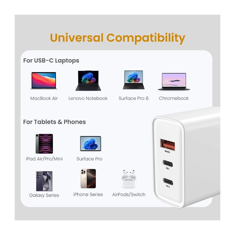 One of the standout features of this charger is its universal compatibility. Whether you need to charge a smartphone, ultrabook, tablet, or gaming console, the Adapto 45C is your all-in-one solution. It supports multiple fast charging protocols such as QC, PD 3.0, and PPS, making it future-proof and versatile.